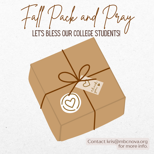 This fall, we want to bless our college students and remind them that they are loved and supported by their church family. Through Fall Pack and Pray, we’ll be sending care packages filled with notes of encouragement, prayer, and mail-safe snacks to let them know they are in our hearts.